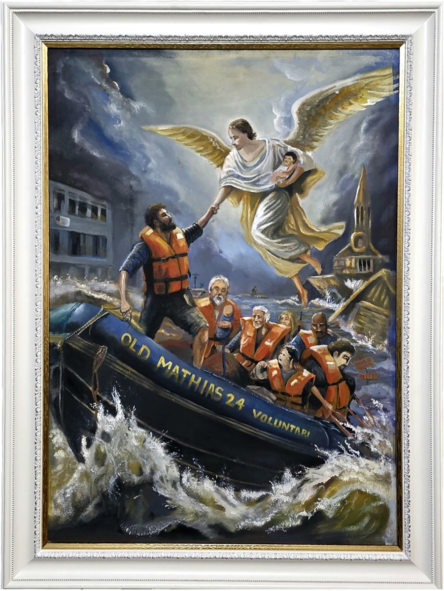 Voluntari (2025) – Óleo, 50x70 cm – Inspirado na enchente de Canoas; retrata resgate com anjo e voluntários em barco (exibido na Casa do Rosas).