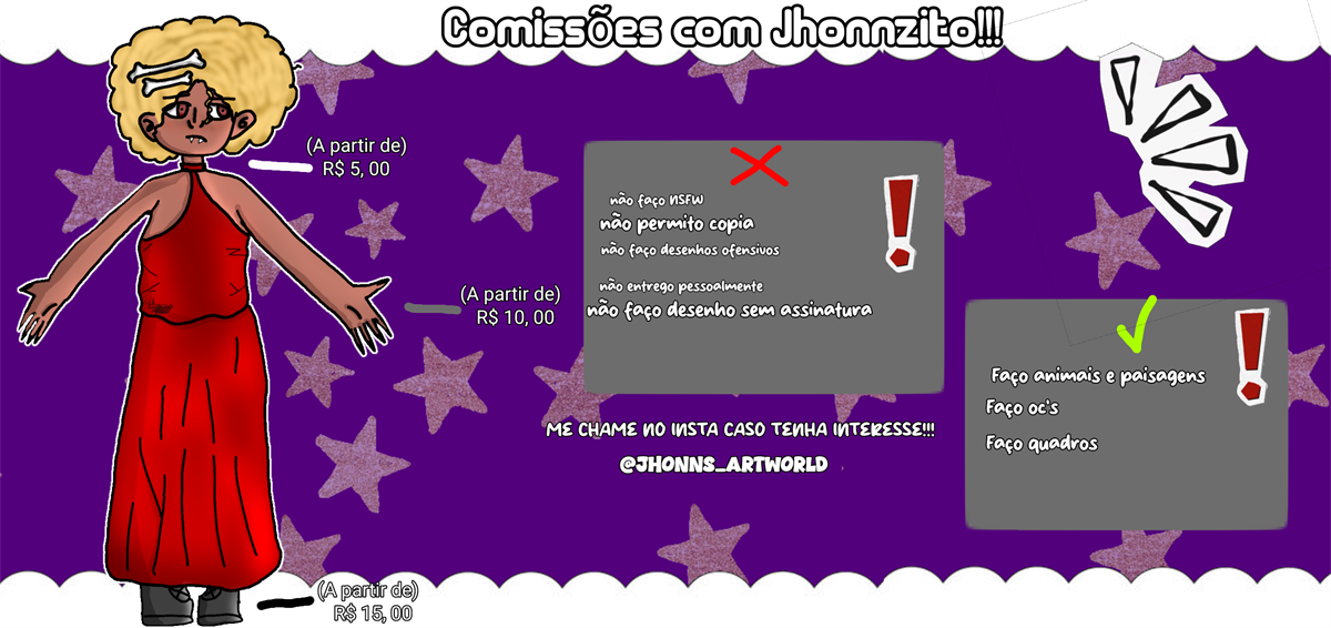Jhonnathan é um artista amador extremamente apaixonado, suas obras geralmente retratam personagens criados por ele ou sentimentos muito fortes que ele sente sendo uma pessoa que experiênciou pouco, mas já tem muita emoção e amor em todas as suas artes, de mais variados tipos, estilos e materiais.