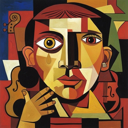 Estilo Cubista: O rosto da figura central é fragmentado e desconstruído em diversas formas geométricas (triângulos, retângulos, losangos), pintadas com cores sólidas. Essa técnica cubista permite que múltiplos ângulos e perspectivas sejam apresentados simultaneamente.