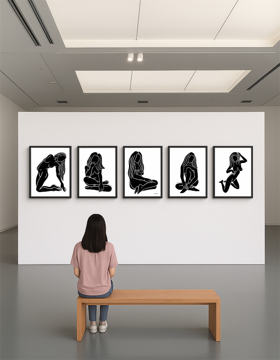 Nessa composição, a figura se dobra, um arco de vida e entrega, onde a escuridão absoluta do corpo contrasta com a linha fina e branca que delineia suas curvas, seus seios, a cascata de cabelos que se derrama. Não há rostos, mas há uma profusão de sentimentos: a leveza de um suspiro, a força de um ato, a dança silenciosa de uma alma que se expressa através da matéria. A inspiração na xilogravura confere à obra uma atemporalidade e uma robustez visual, como se a imagem tivesse sido gravada no tempo antes mesmo de ser pintada.