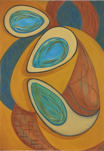 Pintua abstrata, óleo, com 3 capsulas implantadas em estrutura, nas cores marrom e azul.