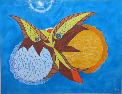 Pintura abastrata, óleo, representando um ser alado voando em direção a um portal