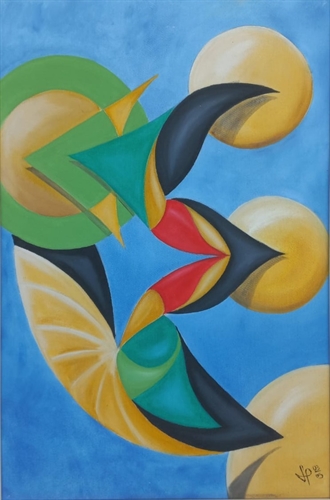 Pintura abstrata, óleo, com objeto em voo livre e 3 esferas amarelas