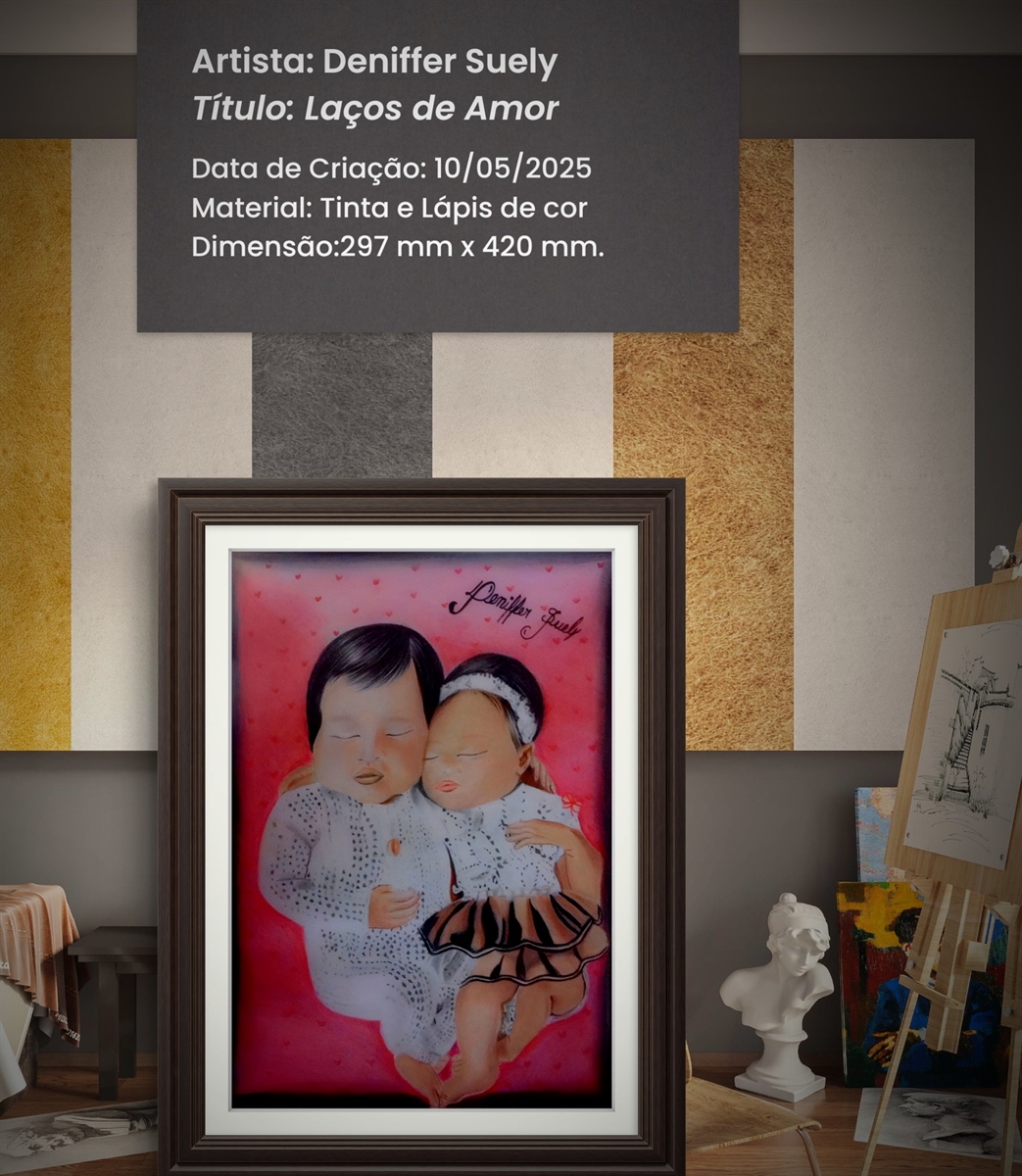 "Laços de Amor", criada em 10 de maio de 2025, é uma tocante obra de arte que captura a ternura entre duas crianças pequenas. Executada com tinta e lápis de cor sobre uma superfície de 297 mm por 420 mm, a peça centraliza-se em um retrato de duas crianças abraçadas.