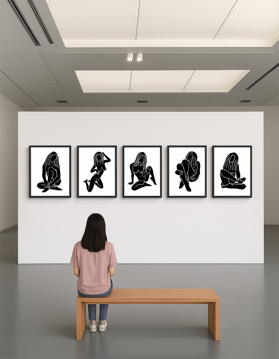 A figura de "Dakota" se curva sobre si mesma, em uma pose de profundo recolhimento e introspecção. O corpo, preenchido por um preto denso e absoluto, é delicadamente contornado por finas linhas brancas que emergem do fundo, as pernas abraçadas e os braços segurando as mesmas. Seus curtos cabelos caem, quase como um véu. O rosto não detalhado, acentua a sensação de um momento particular, de vulnerabilidade e autoproteção. A ausência de feições permite que a figura se torne um espelho para as emoções universais.