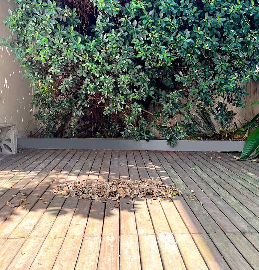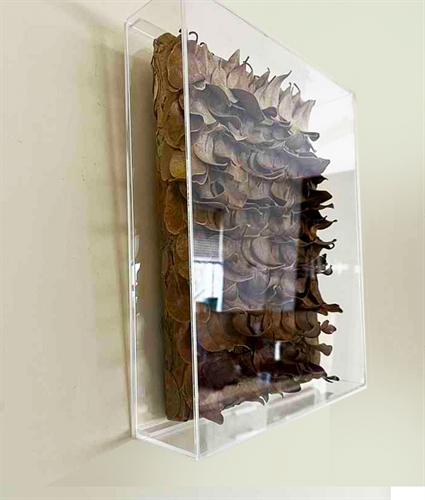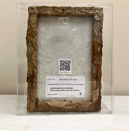 Esta obra é uma composição em relevo criada a partir de folhas naturais da árvore fícus microcarpa, cuidadosamente selecionadas, secas e fixadas sobre tela, formando uma superfície orgânica tridimensional.
