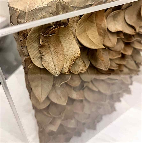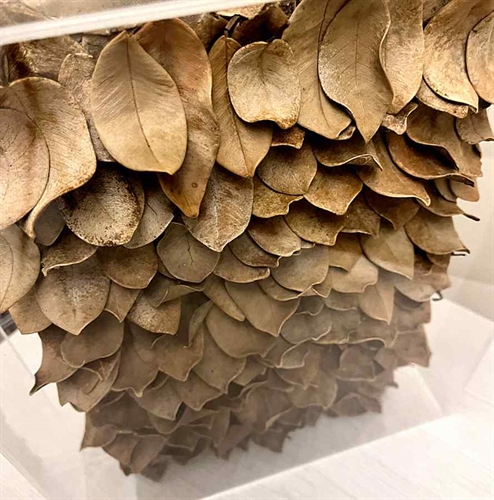 The arrangement of the leaves respects their original shapes, nuances, and undulations, creating a gradient that ranges from soft gold to deep brown—a transition from day to night in vegetal matter.