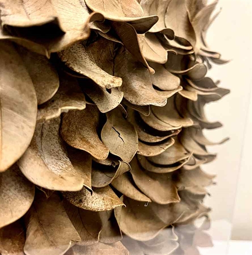 This work is a relief composition created from natural leaves of the ficus microcarpa tree, carefully selected, dried, and fixed to canvas, forming a three-dimensional organic surface.