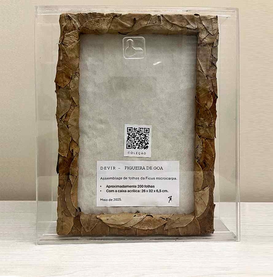 A peça é protegida por uma caixa acrílica translúcida, que preserva cada detalhe e confere à obra ares de galeria de arte, destacando sua presença no ambiente.