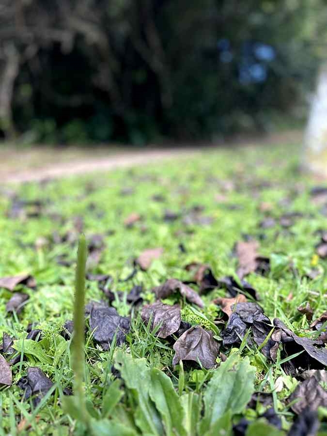 A cor intensa que a folha adquire ao longo do tempo — transformando-se de um verde profundo em um tom brilhante, quase preto — cria um contraste dramático e único.