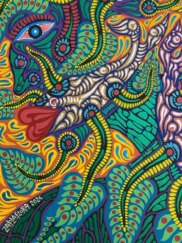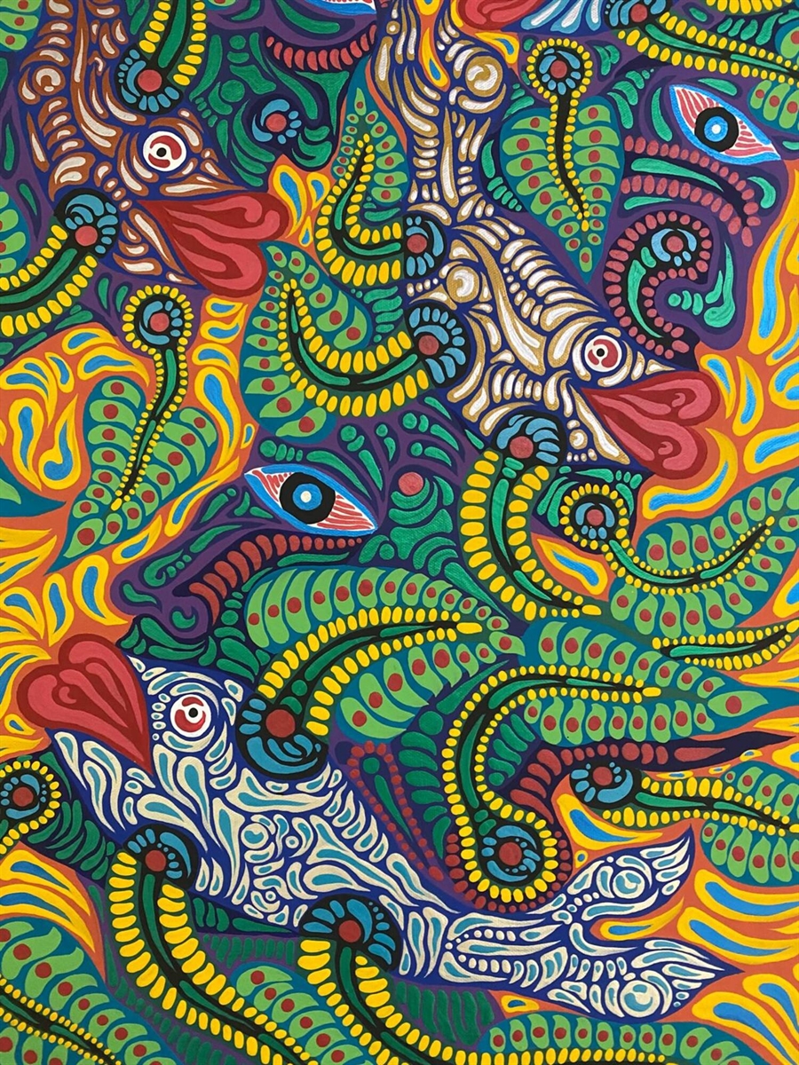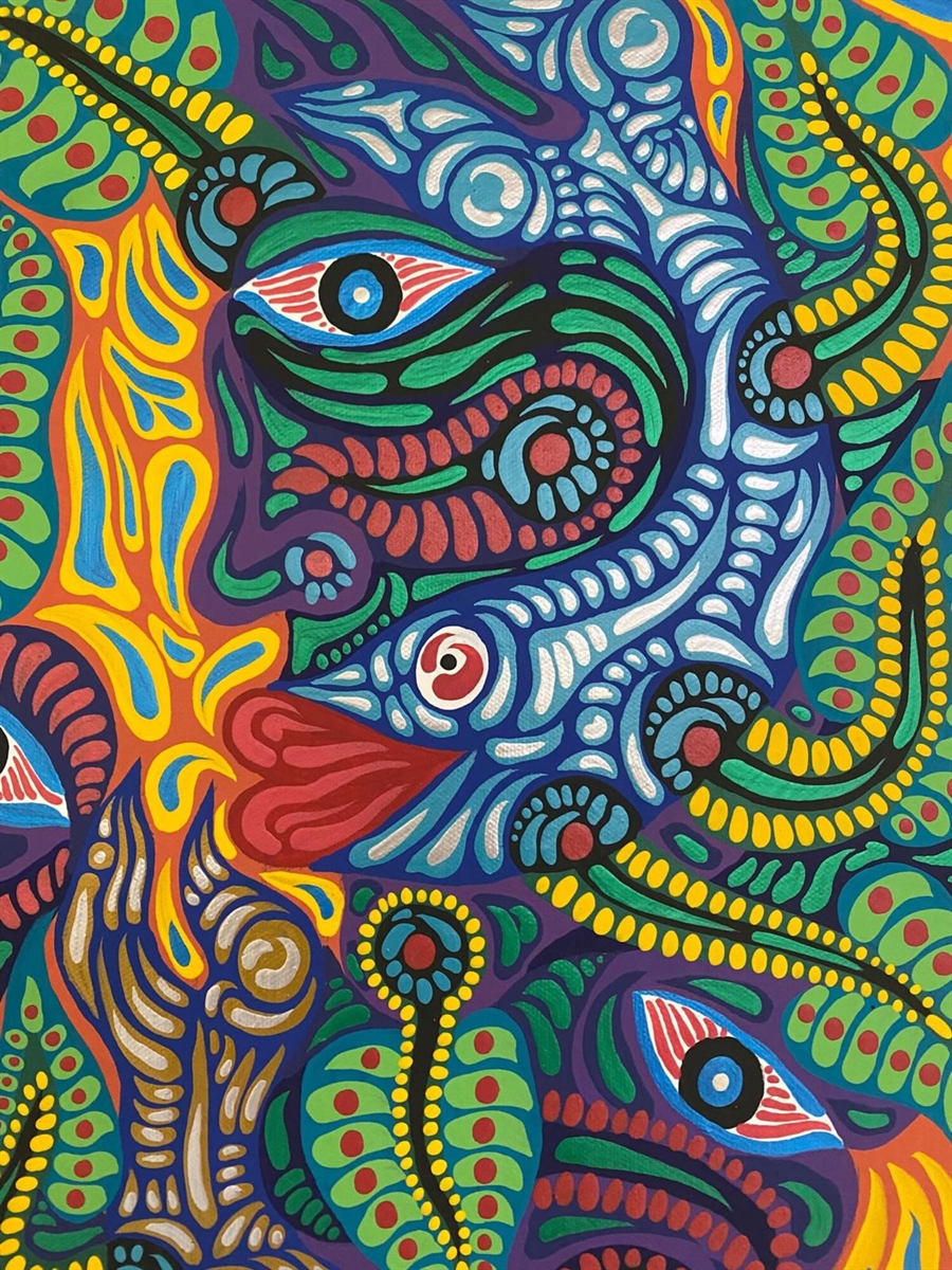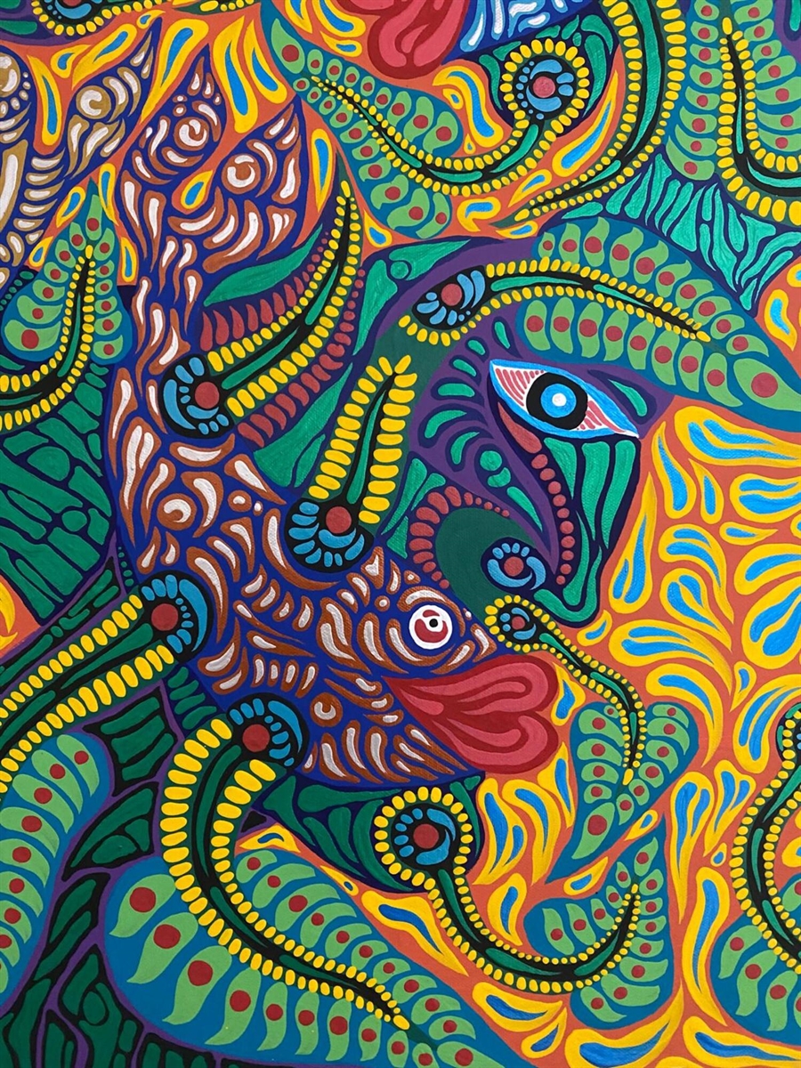 This work expresses my vision of a blooming ocean where oceanic forces are not the sole source of movement. In this painting, the ocean's movement is achieved through the presence of fish swimming freely amidst the dense aquatic flora, oblivious to any disturbance caused by humans. This work, laden with profound symbolism, is a call to human respect for the ocean and its natural inhabitants. It contains eight faces, integrated with the shape of eight fish, that symbolizes humans protecting life in the ocean. Number eight has for me a special meaning that deals with success and good luck.