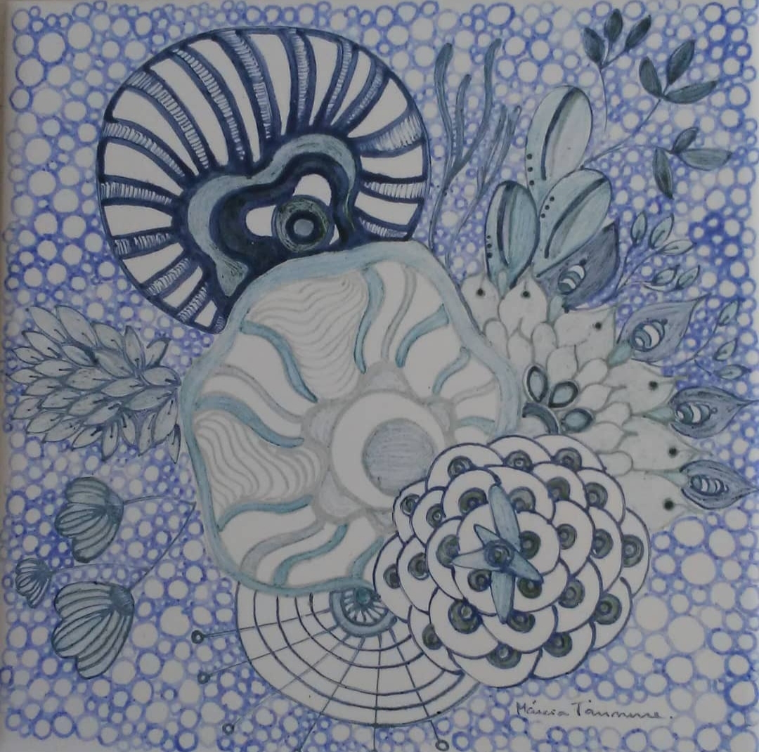 Azulejo em tons azuis, pintura feita com caneta bico de pena. Inspiração flora marinha.