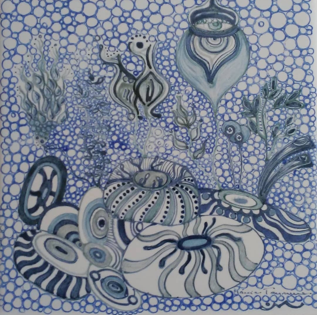 Azulejo em tons de azul. Pintura feita com canela bico de pena. A peça foi queimada num forno cerâmico à 800 graus.