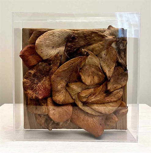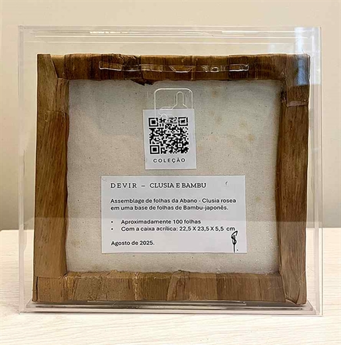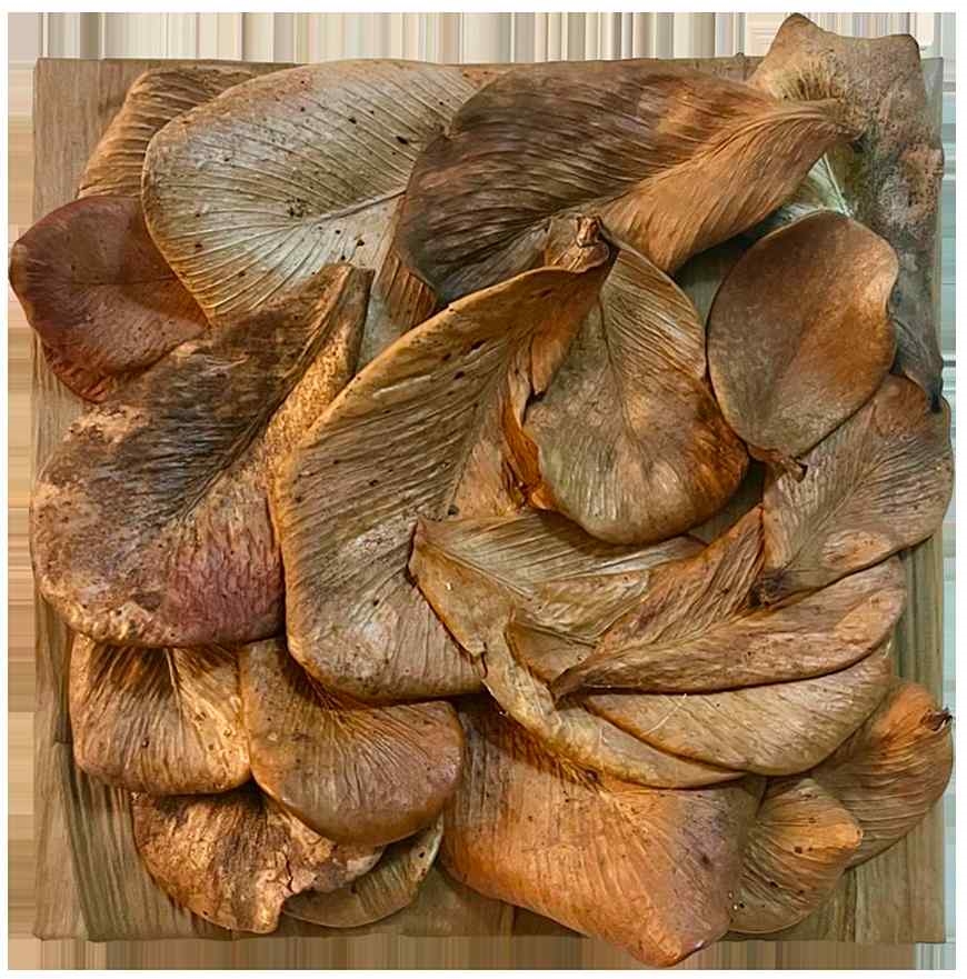 Quando desidratadas estas belas e coloridas folhas assumem um estado de maior rigidez, e por isso elegemos nosso “papiro” predileto que são as folhas do bambu japonês, extremamente resistente e maleável, para forrar o quadro que irá receber essas benditas folhas.