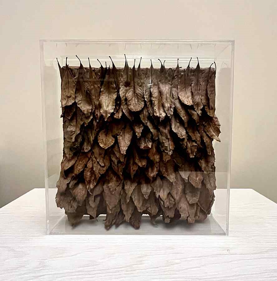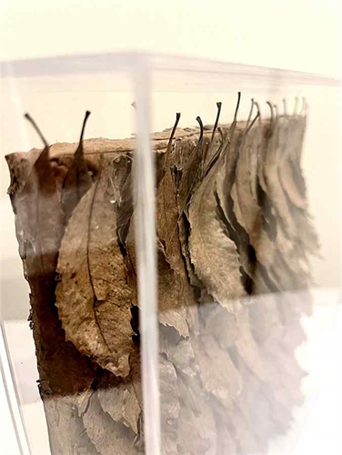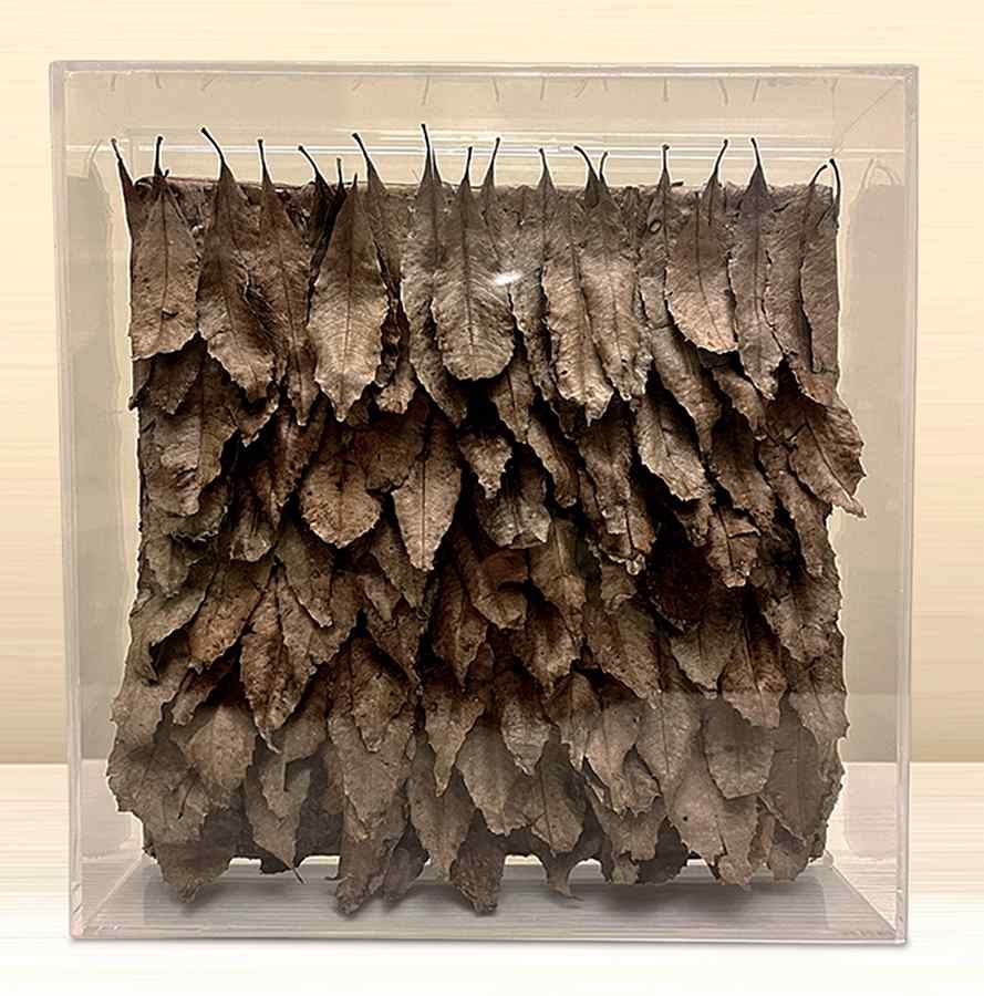 A parte superior mostra a parte que ligava as folhas ao galho coroando esta obra biofílica desta coleção.