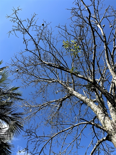 Its capsule-shaped fruits open, releasing kapok, a white, silky fiber that encases the seeds and is dispersed by the wind, ensuring the perpetuation of the species.