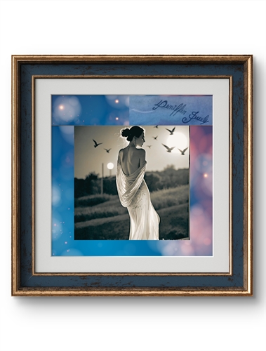 "A obra captura a silhueta graciosa de uma mulher, de costas, vestindo um traje. Ela observa o horizonte enquanto pássaros voam em um céu iluminado pelo sol, transmitindo uma sensação de serenidade e aspiração."