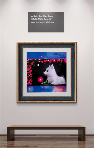 Um filhote branco repousa tranquilo sob o céu estrelado, cercado por flores vibrantes que contrastam com o fundo escuro. A cena transmite paz, pureza e encanto, como se a noite guardasse em silêncio a doçura de um momento eterno.