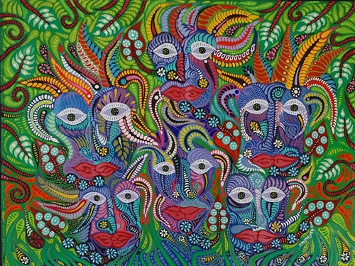 In this colorful painting full of light and creative values, you can see many faces eager to find light, that put their heads out the thick vegetation that has kept them in the dark in the past. This artwork is a chant to Man´s permanent search to find the light, the knowledge, the spirituality and the path towards the truth in Life. These faces with so widely open eyes repudiate their past in the darkness, looking for a brighten present.