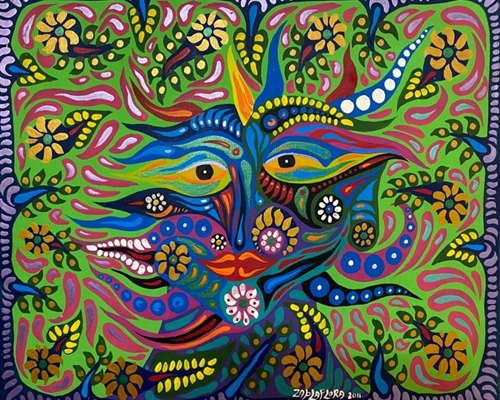 This colorful work is inspired by those inhabitants of the Amazon who still today preserve the practice of painting their faces with a variety of shapes and colors. While I was creating it, I imagined what one of those faces could look like in a close-up photo for an identity card or a driver's license. "Photo From the Amazon", of many creative values and a great set of colors, makes us recall the naive style, and it would look very nice in a children or teenager´s bedroom.