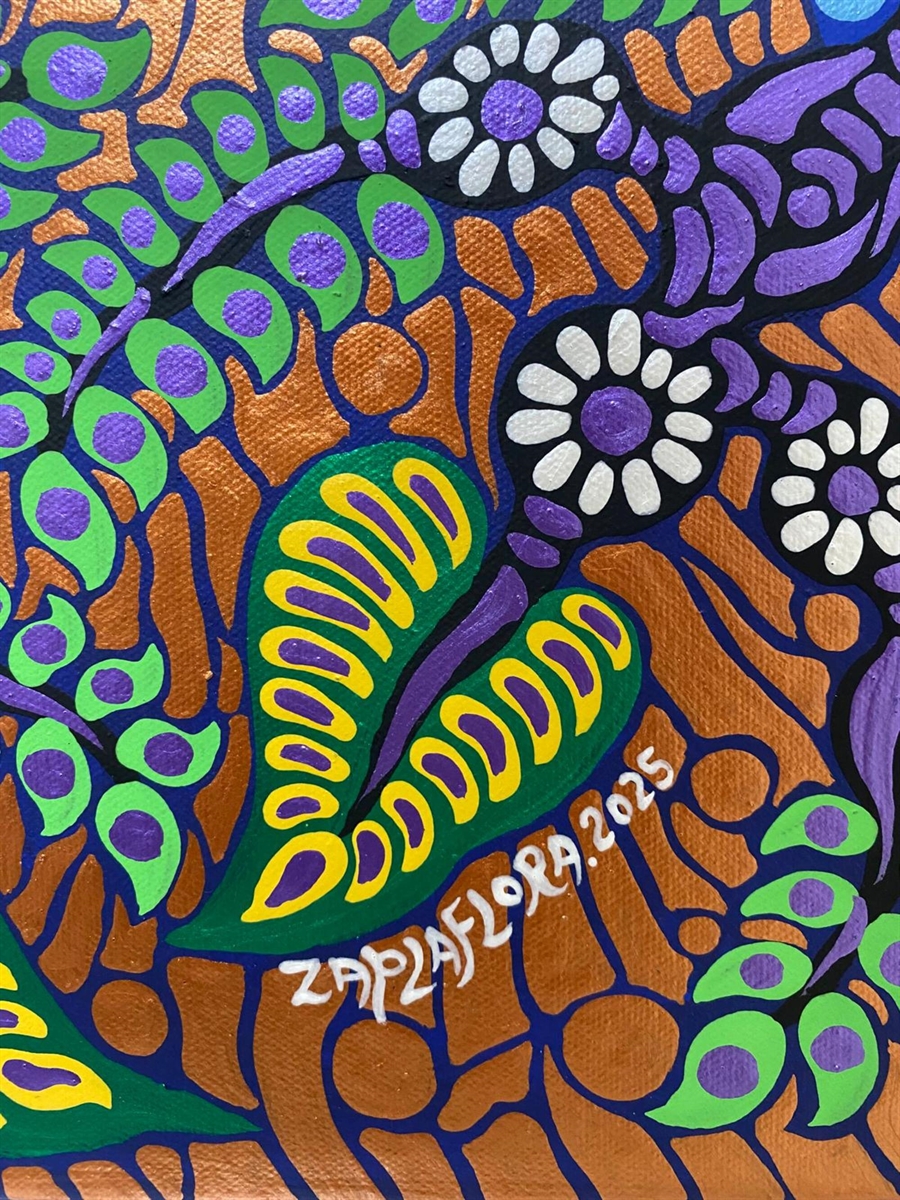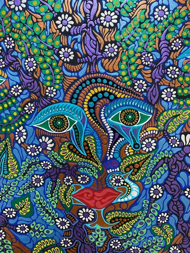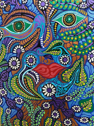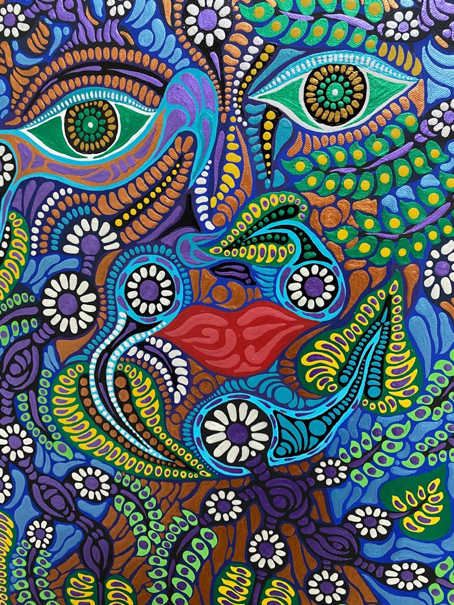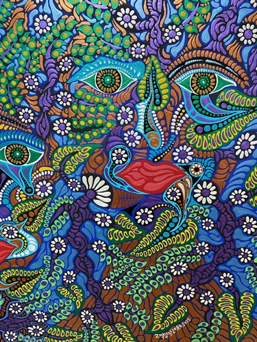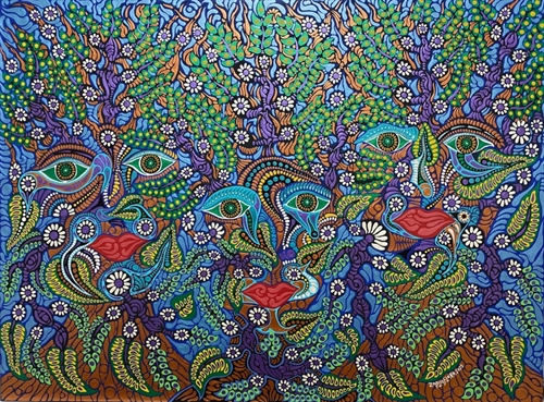 I started this painting to participate in a gallery exhibition in New York. The title of the exhibition was "Eyes: a passage to the inner world." So I created a painting with characters with big, expressive eyes, in the middle of a thick forest that represented my inner world. I titled my painting: "Through my eyes." But one of my grandchildren was interested in taking up the title of my painting, and he advised me to title it "The Jungle Tribe", because in his opinion the characters in my painting represented a tribe in the middle of the jungle, which could very well be the Amazon. Titled "Through My Eyes" or "The Jungle Tribe", here is a painting in my most personalized style that, without intending to, has made me return to the first years of my artistic career where the theme of the jungle and the Amazon was recurring in my works.