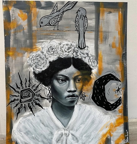 Obra surrealista com elementos de cordel na técnica acrílica.