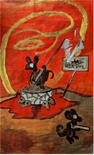 Ratos, no poder lutando pelo seu ego inflado e um hipocrisia demostrada na cena onde estão, todos com armas e bandeira branca da paz com resquício de sangue.
