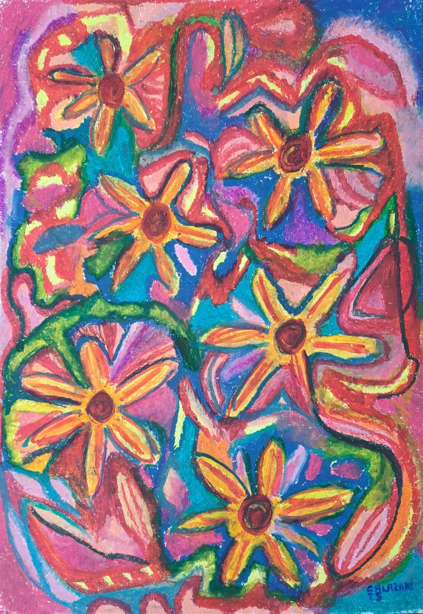 Descrição: Flores psicodélicas. Giz pastel oleoso sobre papel Canson 300g formato A3 (29,7x42cm).