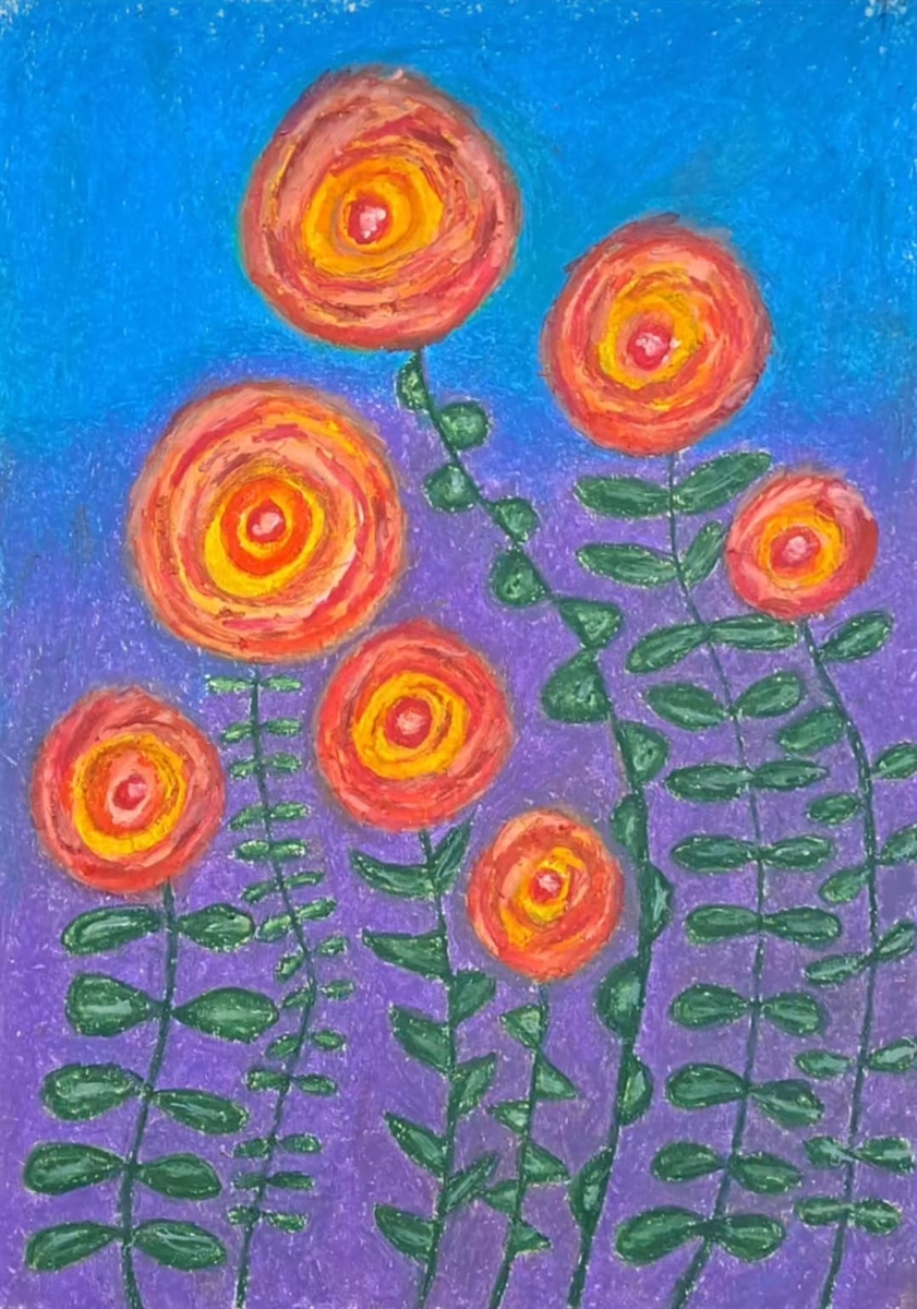 Flores-sóis. Giz pastel oleoso sobre papel Canson 300g formato A3 (29,7x42cm). (vendida)