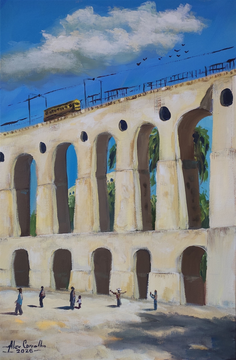 A pintura retrata os icônicos Arcos da Lapa, no Rio de Janeiro, em uma cena ensolarada que valoriza tanto a imponência arquitetônica quanto a vida cotidiana que se desenrola ao seu redor.