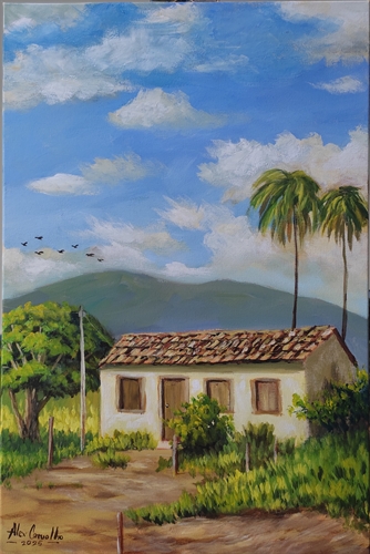 A obra retrata a simplicidade e a beleza de uma casa rural diante da imensidão da natureza.