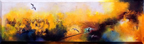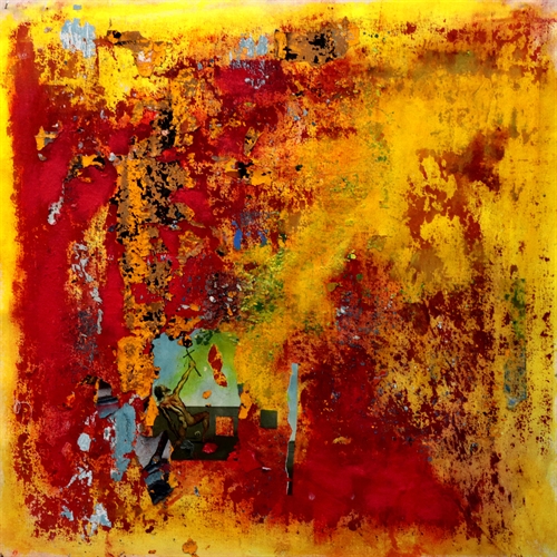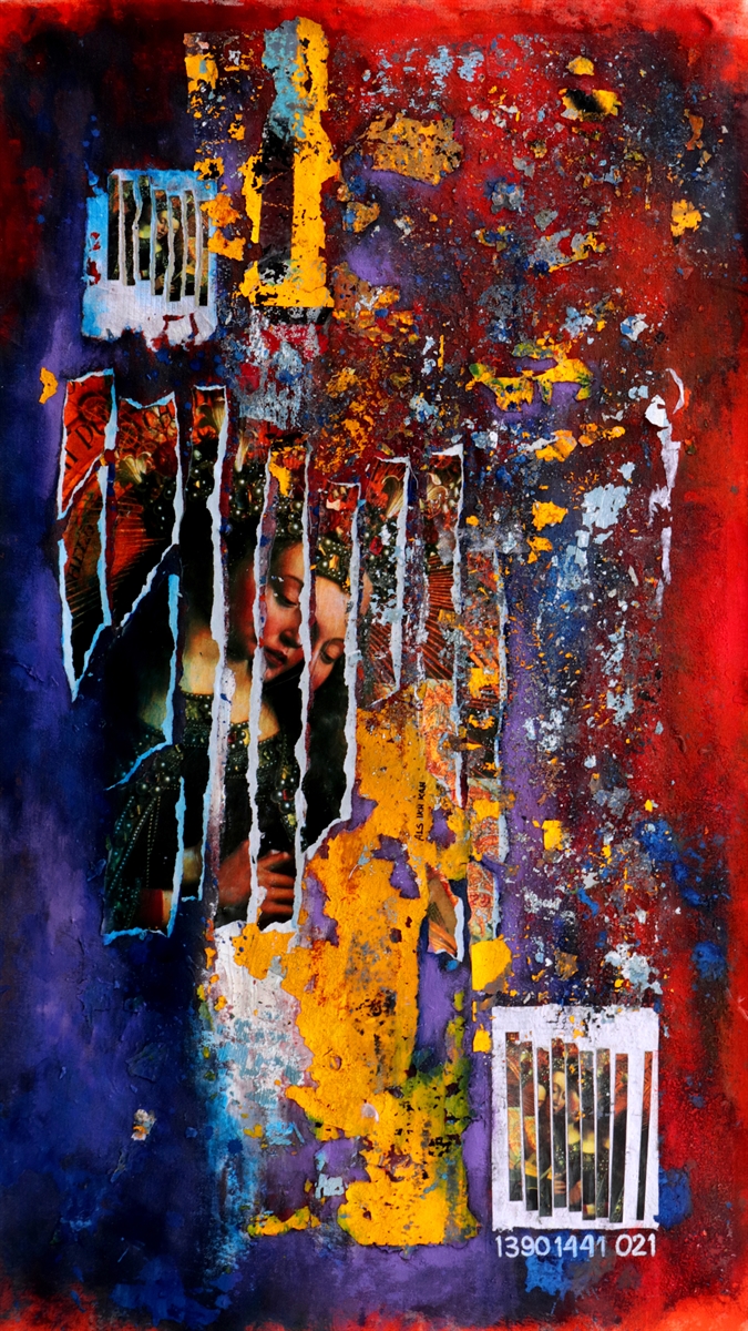 Neste trabalho, utilizei, além da tinta acrílica, colagem, reaproveitamento de tinta industrial, impressão jato de tinta sobre tela.