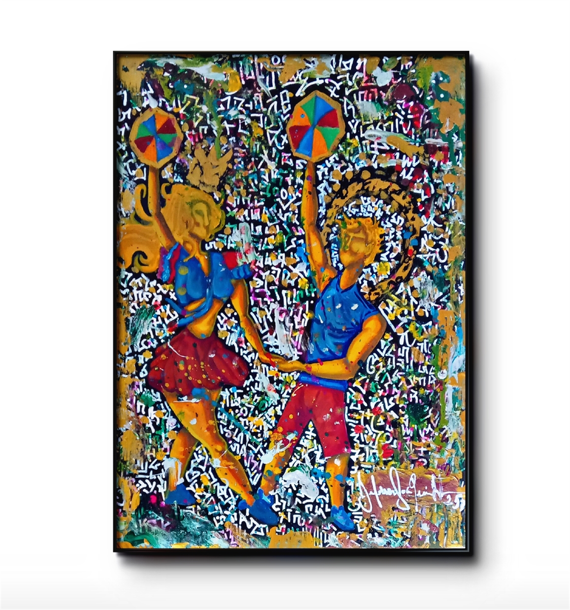 Esta obra retrata um casal dançando frevo em uma explosão de ritmo, cor e movimento. A combinação de nanquim, aquarela e acrílica cria camadas ricas, texturizadas e vibrantes, enquanto os detalhes em Posca e o toque de tinta dourada acrescentam luminosidade e caráter contemporâneo.