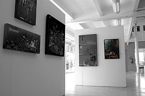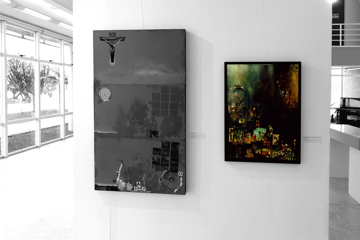 Além da colagem, utilizei nesta obra tinta acrilica, resíduo de tinta industrial e impressão jato de tinta sobre tela.