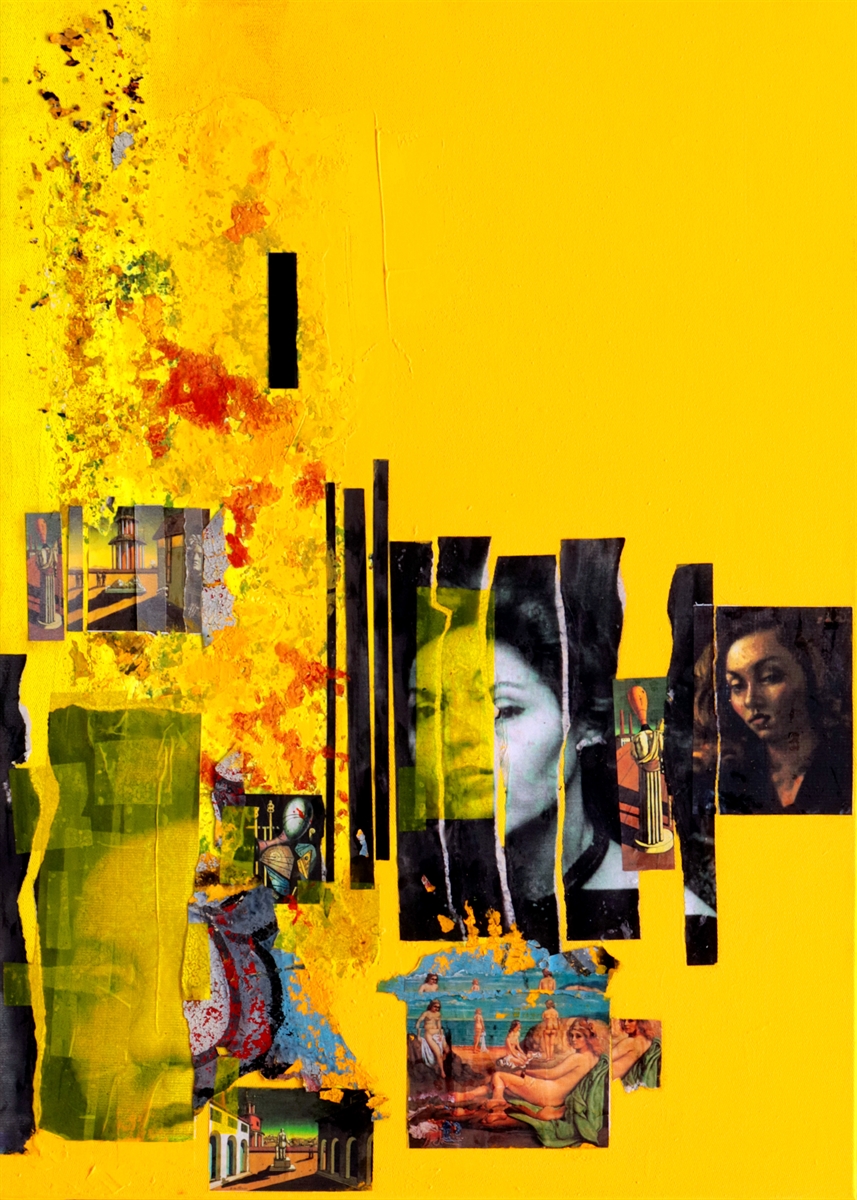 Tinta acrílica, impressão jato de tinta e colagem sobre tela.