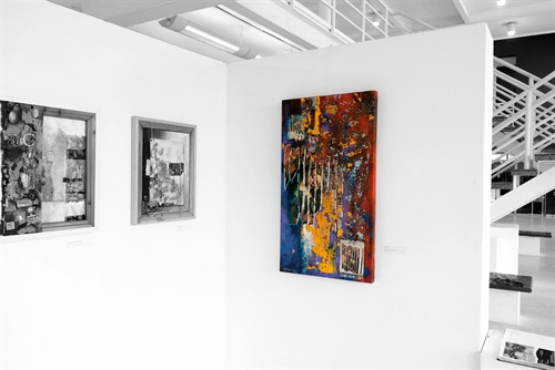 Neste trabalho, fiz uso da tinta acrílica, cascas de tintas secas, impressão caseira e colagem sobre tela.