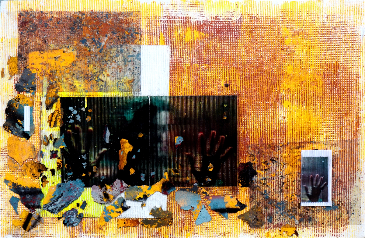 Usei aqui, tinta látex, tinta acrílica, resíduo de tinta industrial e colagem sobre tela.
