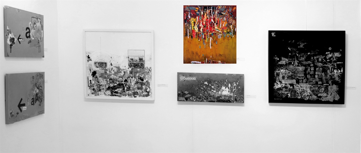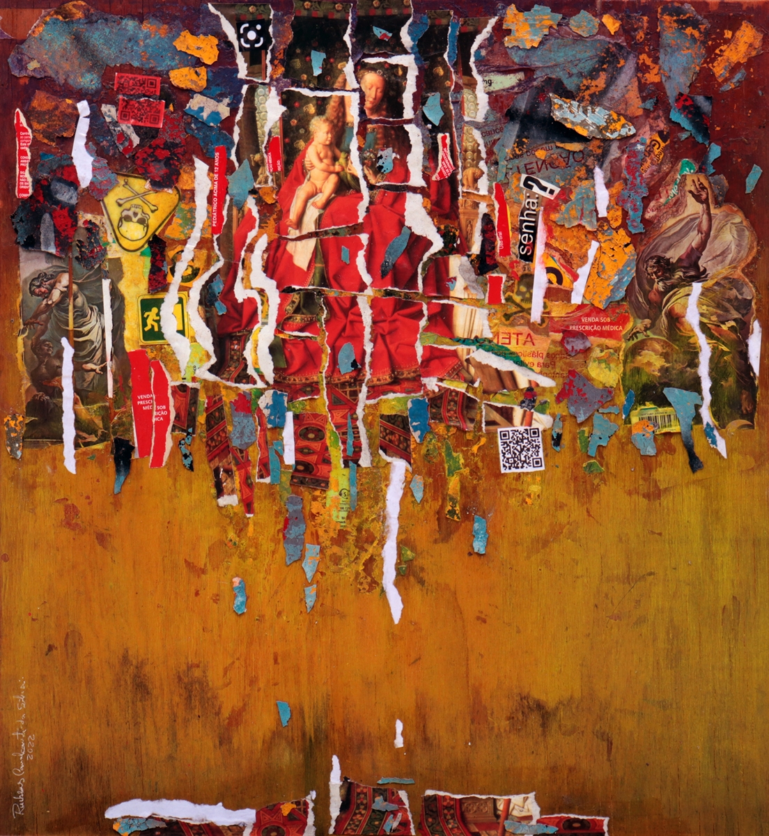 , fazendo uma colagem com vários elementos e ícones modernos. Utilizei, ainda, tinta a óleo como veladura em algumas partes.