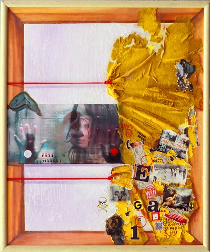 Colagem, tinta acrílica, tinta industrial reaproveitada sobre tela, foram os materiais usados para esse trabalho.