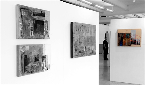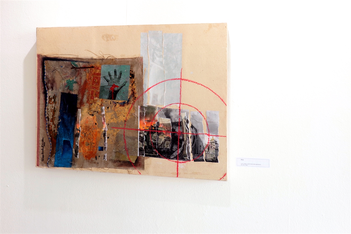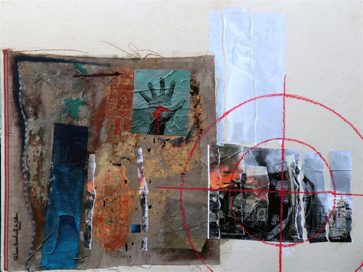 Para esta obra, usei pedaço de linho com textura, colagem e pastel oleoso sobre papel paraná. Também me apropriei de uma imagem da internet sobre a guerra entre Rússia e Ucrânia.