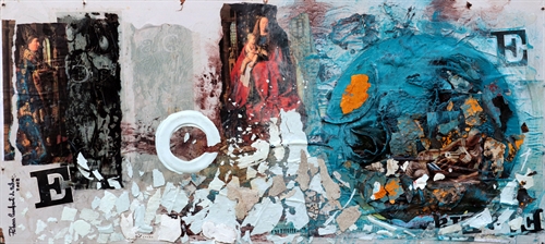 Para essa obra, usei tinta reaproveitada, tinta acrílica e colagem sobre madeira.