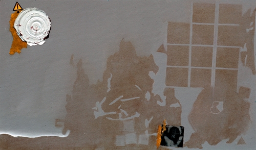 Colagem com tecido (TNT), resto de tinta e impressão em acetato sobre madeira. Utilizei, também, como referência, um qadro de