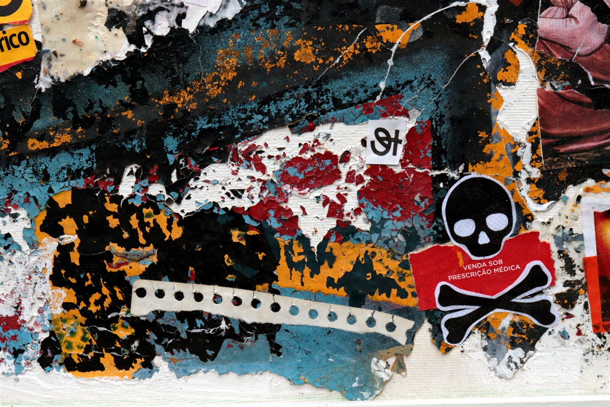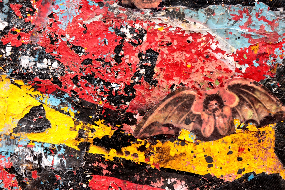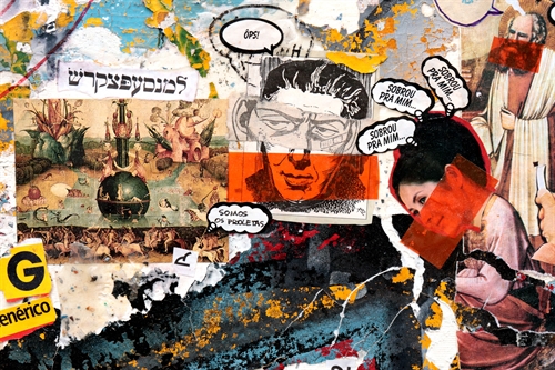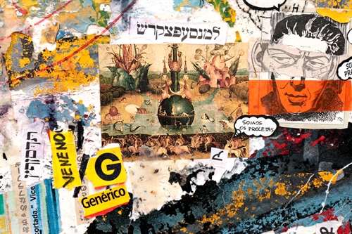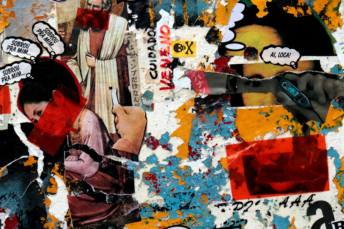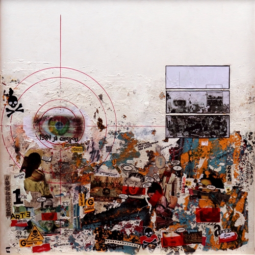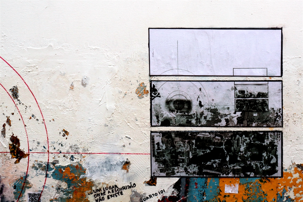 Aqui usei, tinta acrílica, colagem, impressão jato de tinta , fita adesiva e cascas de tintas secas sobre tela.