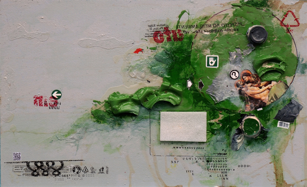 Utilizei aqui, colagem, propaganda de sacolas plásticas e tinta acrílica sobre madeira.