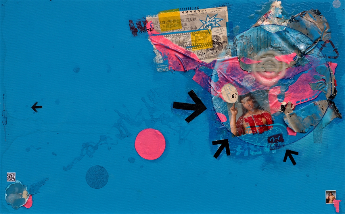 Para esse trabalho, usei resto de tinta, colagem, propaganda de sacolas plásticas e tinta acrílica sobre madeira