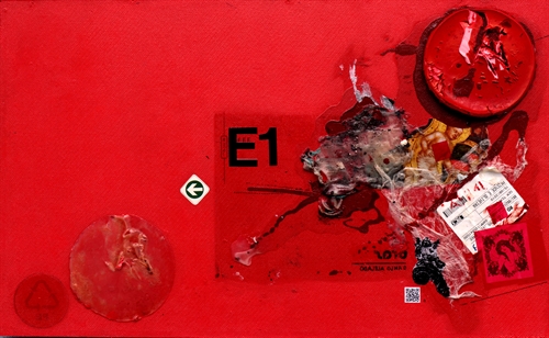 Fiz uso aqui de resto de tinta, colagem, propaganda de sacolas plásticas e tinta acrílica sobre madeira.