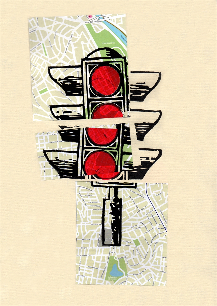 Linóleo e colagem da série Sinal fechado. Impressa sobre mapa de São Paulo e colada sobre Papel Canson creme.