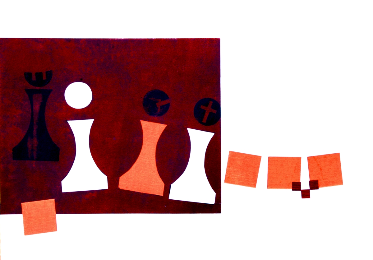 Gravura da série Próximo lance. Aqui faço referência ao jogo de xadrez. Imprimi, primeiramente, sobre papel Canson, as peças referentes a este jogo e adicionei alguns elementos geométricos. Recortei-as e as colei novamente em Canson A3, formando, deste modo, o desenho desejado. São 38 peças no total. Elas foram produzidas em 2019 e no mesmo ano participei de três exposições do Metrô em São Paulo. São elas: Alto do Ipiranga (linha Verde), Corinthians/Itaquera (linha Vermelha) e Estação da Luz (linha Azul). Assista aqui os vídeos no Youtube referente à essas exposições.
