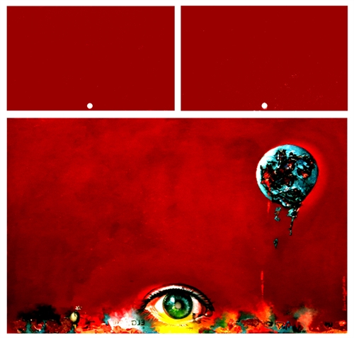 Este é o 1º trabalho, de um total de quatro, da série Horus. Par esse trabalhos, usei tinta acrílica, colagem e restos de tintas sobre madeira. Este é o único em que o vermelho é a cor predominande. Nos outros três, a cor predominante é o azul.