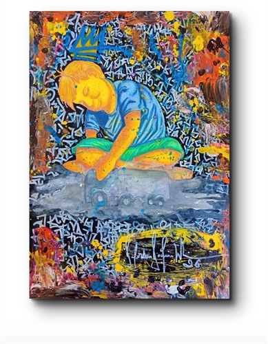 O Pequeno Rei da Estrada é uma pintura que nasce da memória da infância e da força simbólica do brincar. Sentado no chão, de pernas cruzadas, o menino governa seu próprio mundo através da imaginação, transformando um simples caminhão de brinquedo em estrada, reino e destino.
